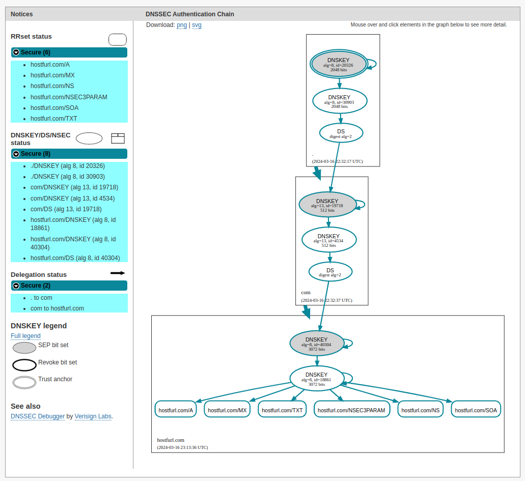 Below is a copy of former DNSSEC status and authentication chain for hostfurl.com, as provided by dnsviz.net.